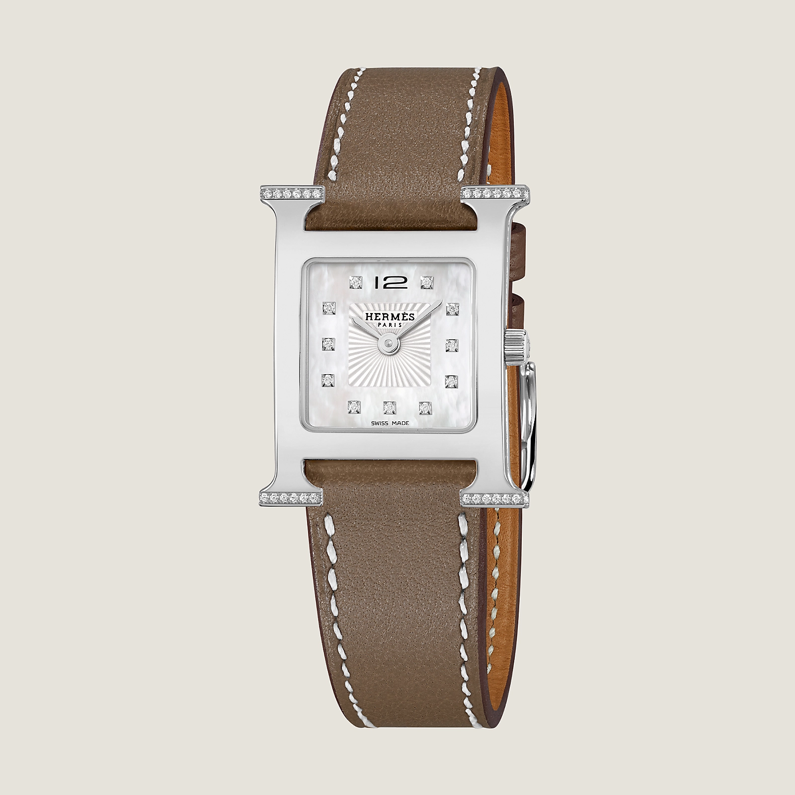 HERMÈS Heure H Small Model watch set with quartz diamond hour markers white mother-of-pearl dial taupe leather strap 25 mm