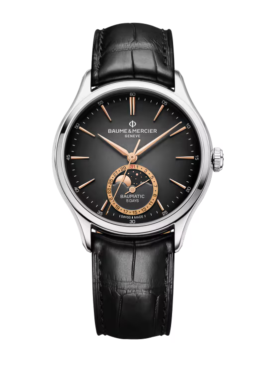 As the ultimate expression of the round timepiece, this sophisticated wristwatch with interchangeable black alligator strap is designed for today's active man. It is equipped with a Baumatic manufacture movement with a five-day power reserve. The traditional moon-phase complication at 6 o'clock enhances the gradient black lacquered dial, with a date indication.