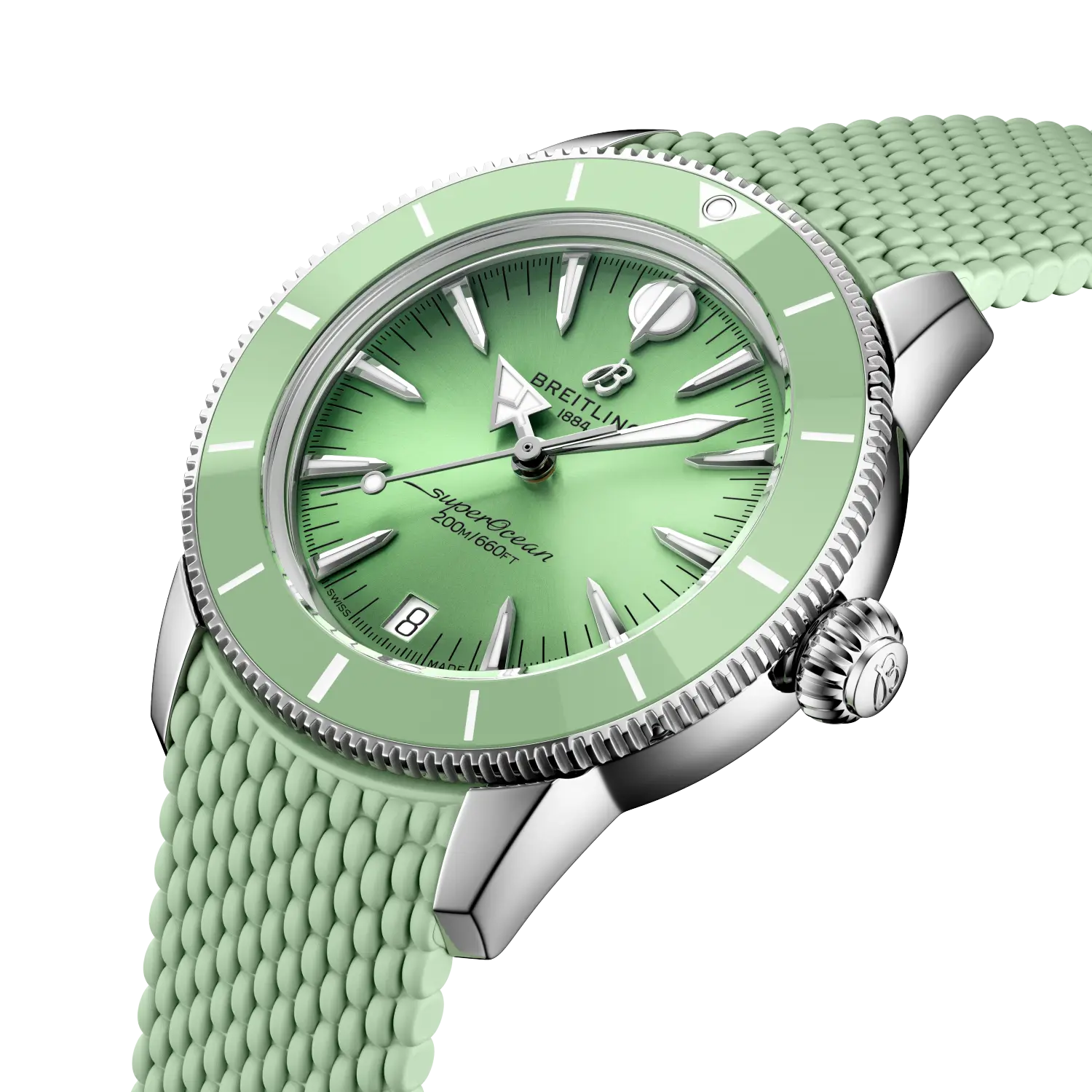Made to move between the waves and the waterfront. When Breitling first launched it in 1957, it took a different tack from other dive watches of the era. The Ref. 1004 (a sleek time-only piece) and Ref. 807 (the world’s first dedicated dive chronograph) weren’t just about exploring the underwater world—they were about looking good doing it. The spear-and-arrow hands, anodized rotating bezel, and naturally sleek proportions made it a favorite of stylish adventurers who lived for the sea and the scene. Today, that philosophy is still at the core of the Superocean Heritage. It’s got the soul of the 1950s, but designed for today. The latest Superocean Heritage builds on everything that made the original distinctive—and sharpens it. A ceramic-inlayed bezel adds exceptional scratch resistance, while integrated mesh-metal or mesh-rubber bracelets fit snugly against the case, secured with folding clasps for a clean, watertight finish. A discreet date window at six o’clock, and the original signature hands—arrow for hours, spear for minutes—ensure legibility and balance, above or below the surface.